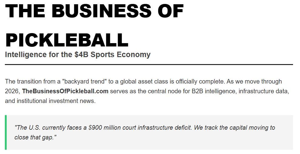 Industry Vision & MissionPickleball has officially graduated from a backyard trend to a serious institutional land grab. It’s no longer just about who has the best paddle; it’s about who owns the real estate, the proprietary tech, and the broadcast rights.TheBusinessOfPickleball.com...was launched to cut through the noise and follow the money. We don’t cover match scores or tournament brackets. We track the contracts, the construction, and the capital that make those matches possible. If you